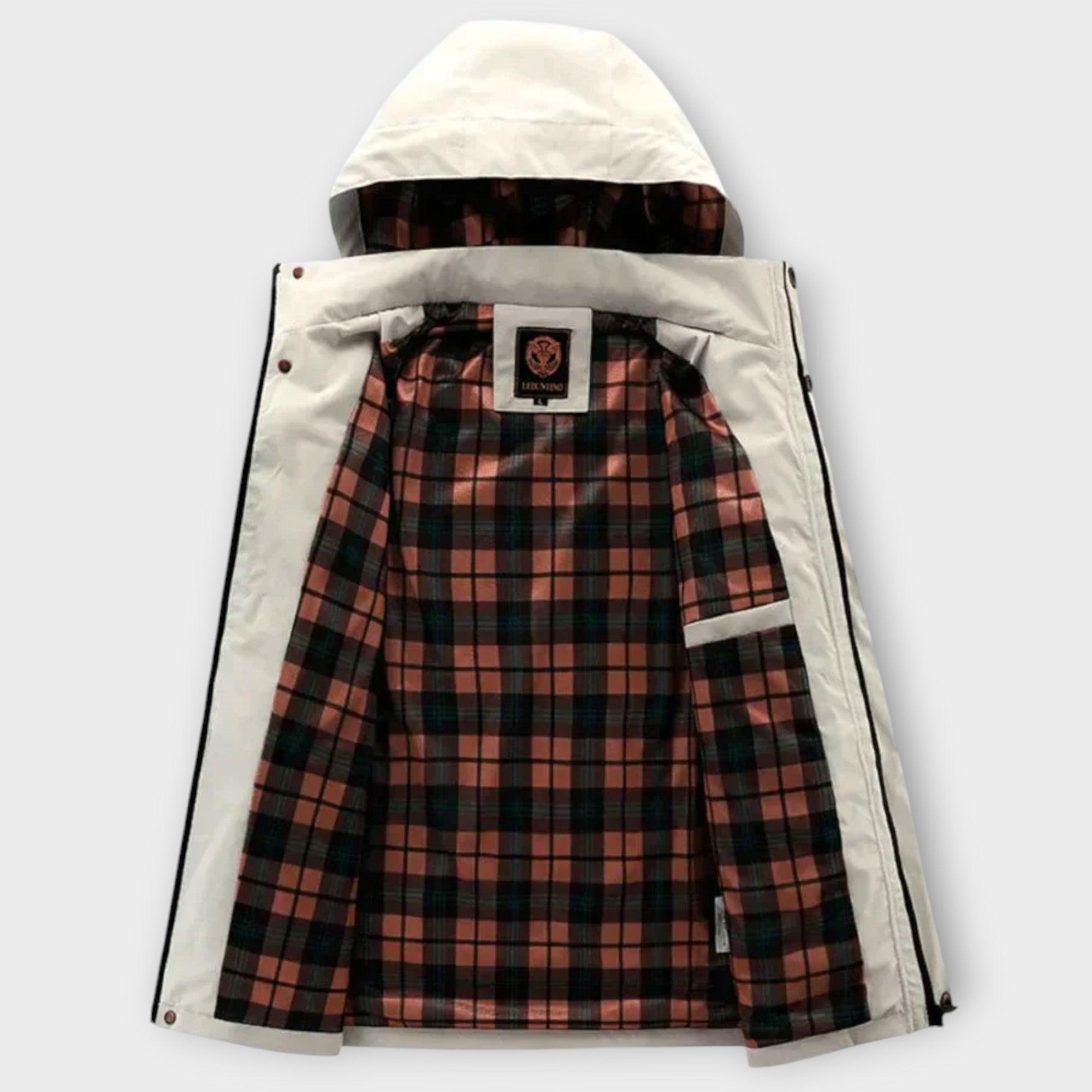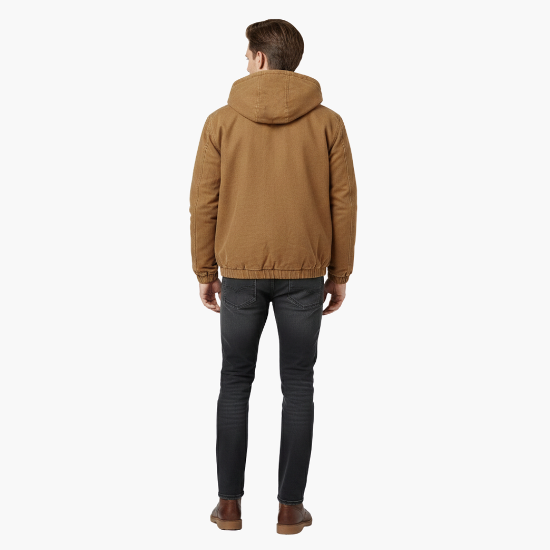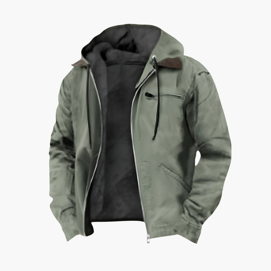 Herrjacka för utomhusbruk med justerbar huva och framdragkedja