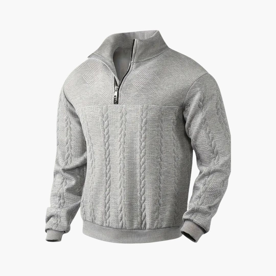 Herrtröja med halv dragkedja och flätstickad struktur.