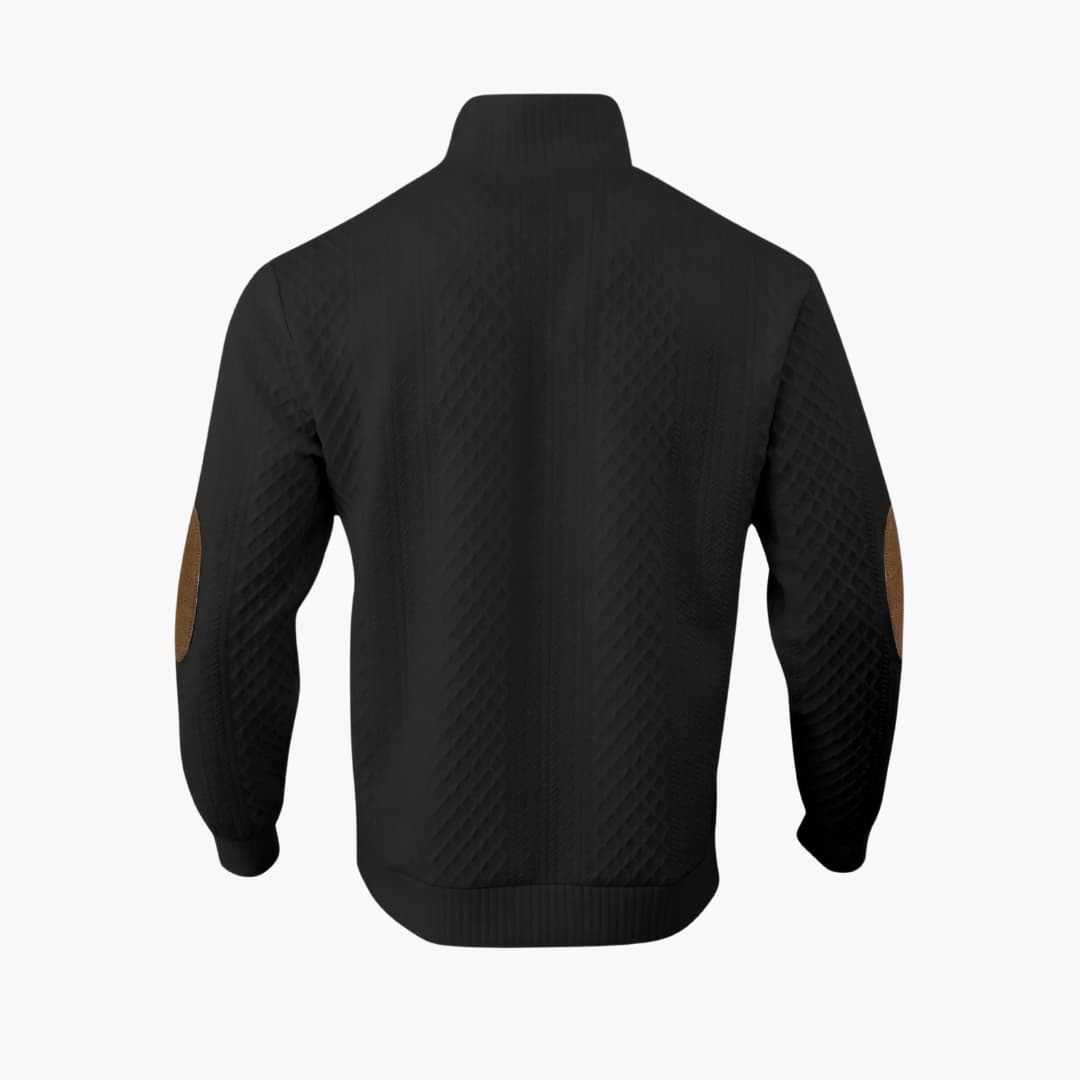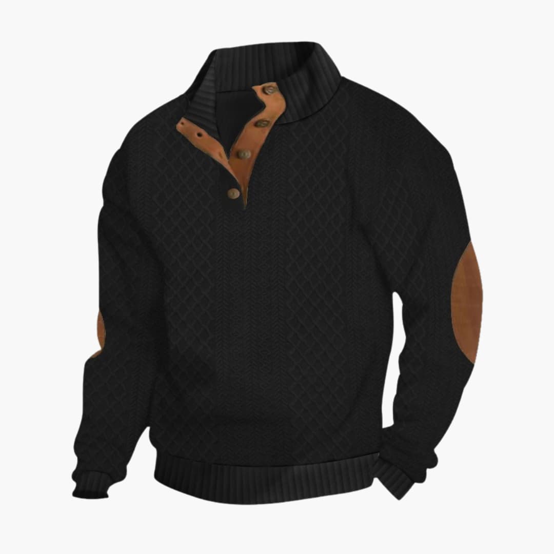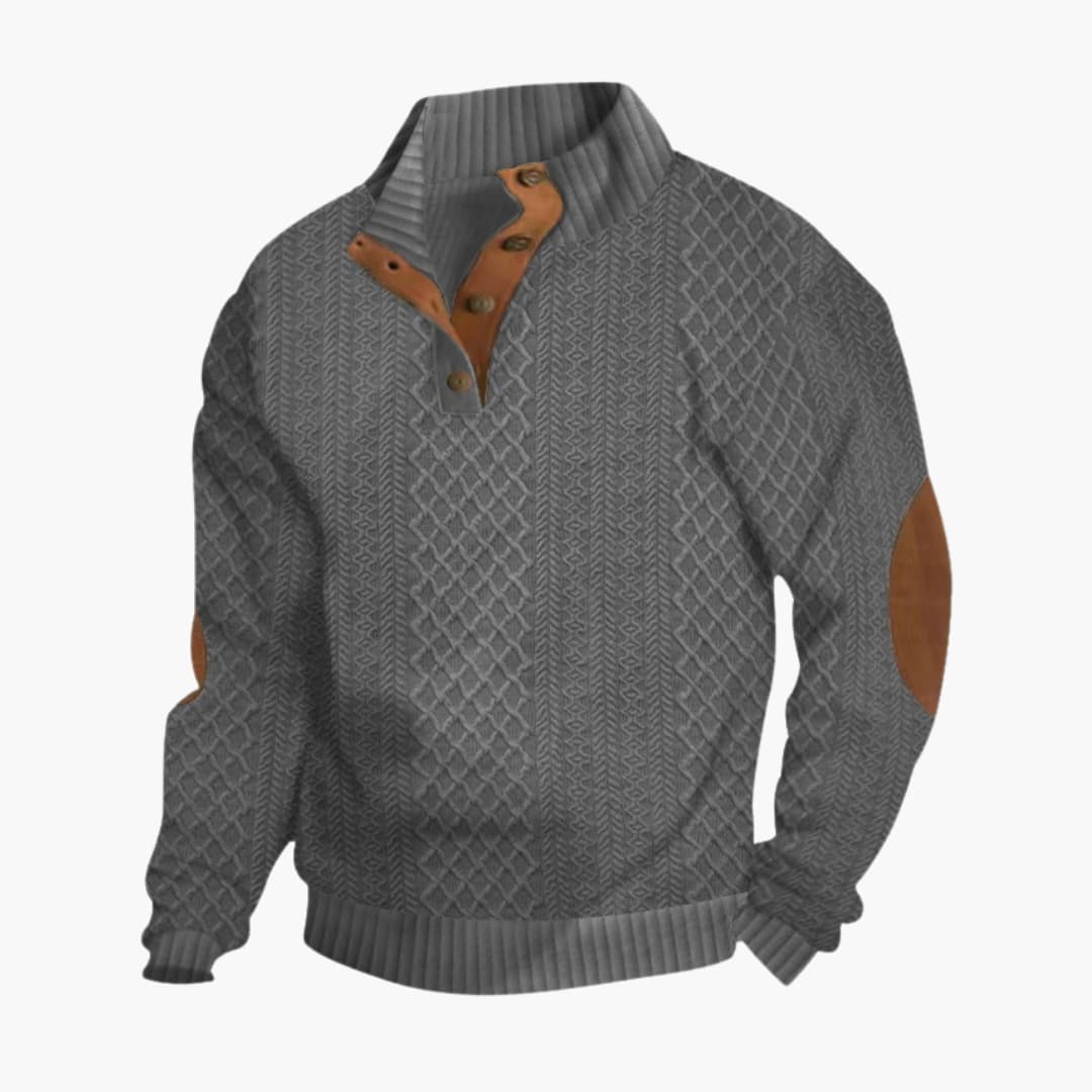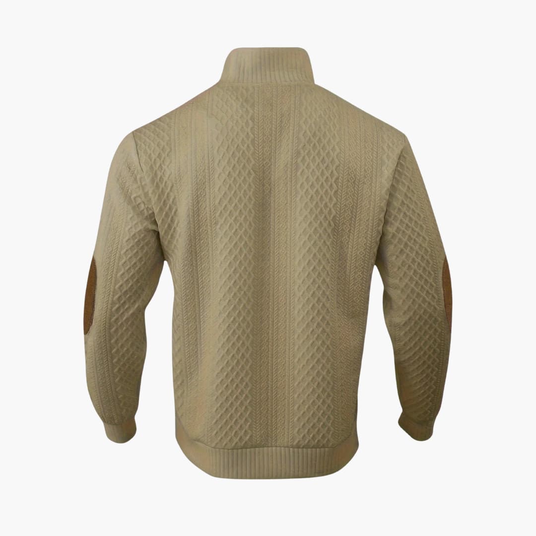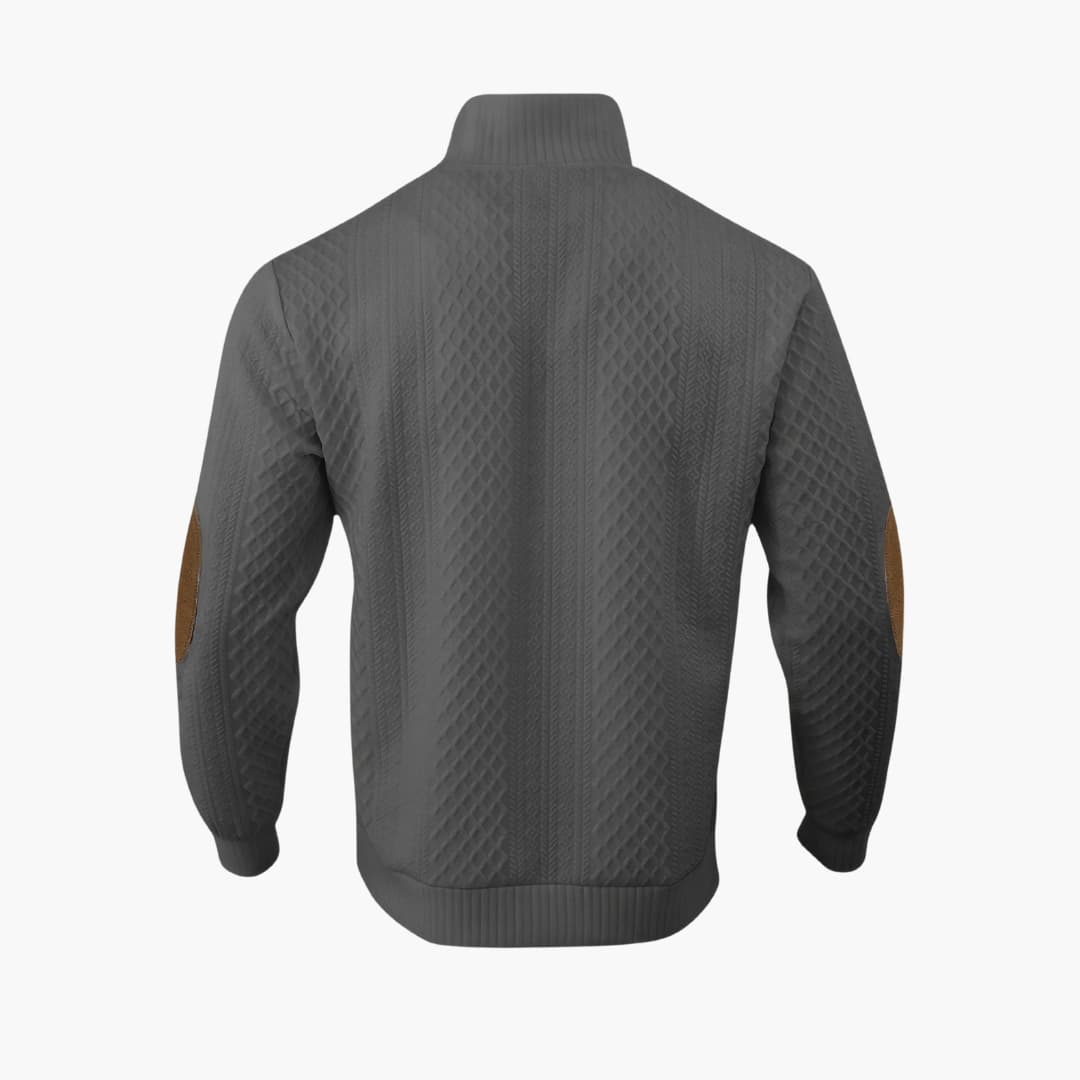 Denna herrtröja har en ribbstickad krage med knäppning och en kort knappslå. De långa ärmarna har applicerade armbågslappar samt ribbstickade muddar. En ribbstickad fåll definierar nederkanten. Plagget har en strukturerad stickad yta över både kropp och ärmar.