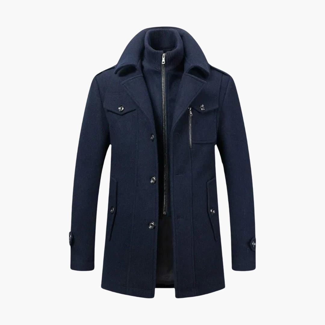 Denna herrrock har ett avtagbart innerlager under en rak stängning framtill. Designen inkluderar sidofickor och långa ärmar för regelbundet bruk utomhus. Fållen har en vävd yta som ger ett ordnat intryck samtidigt som plagget fungerar som ett tvådelat alternativ för skiftande förhållanden.